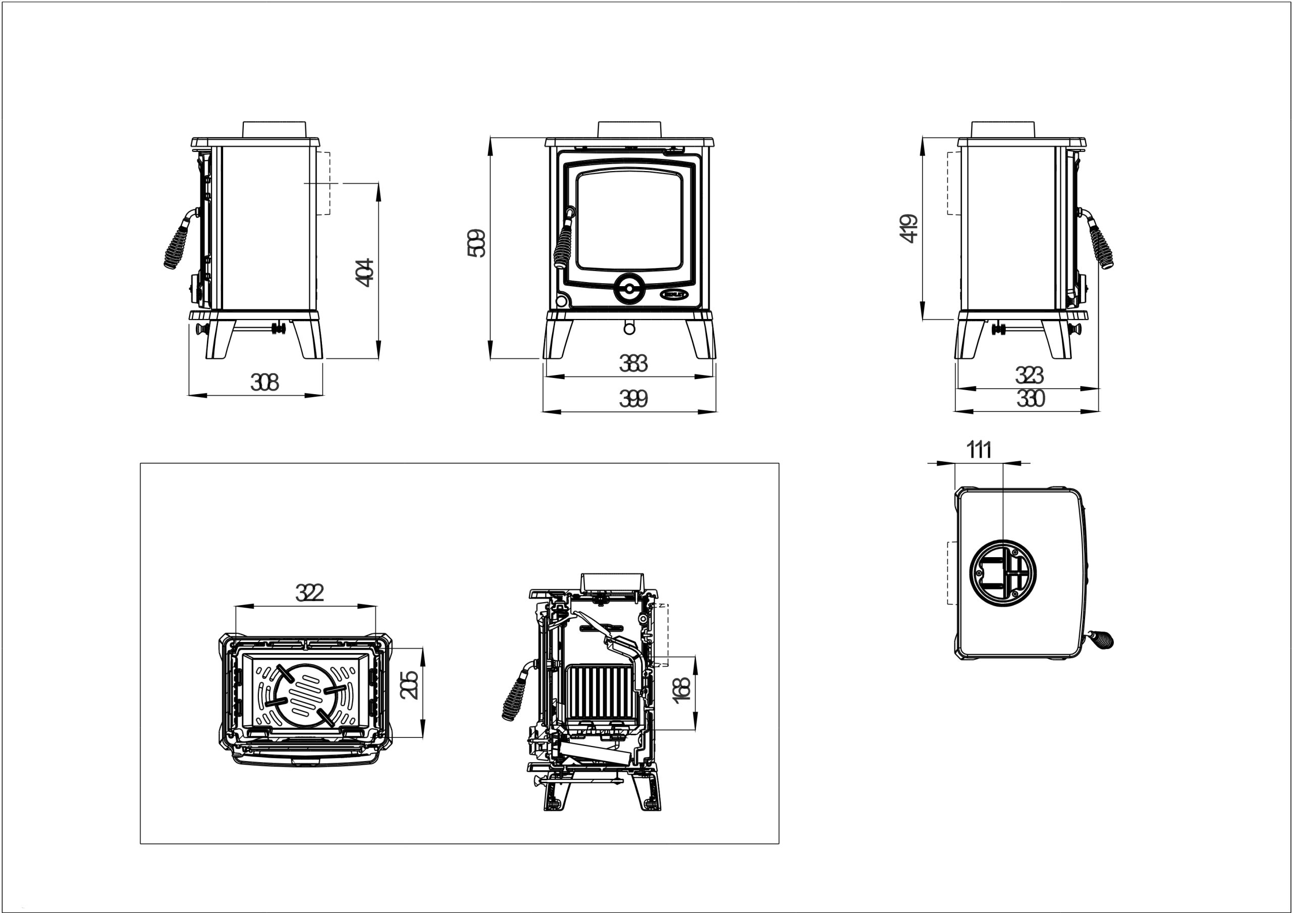 10. Размер дымохода: 125 мм.